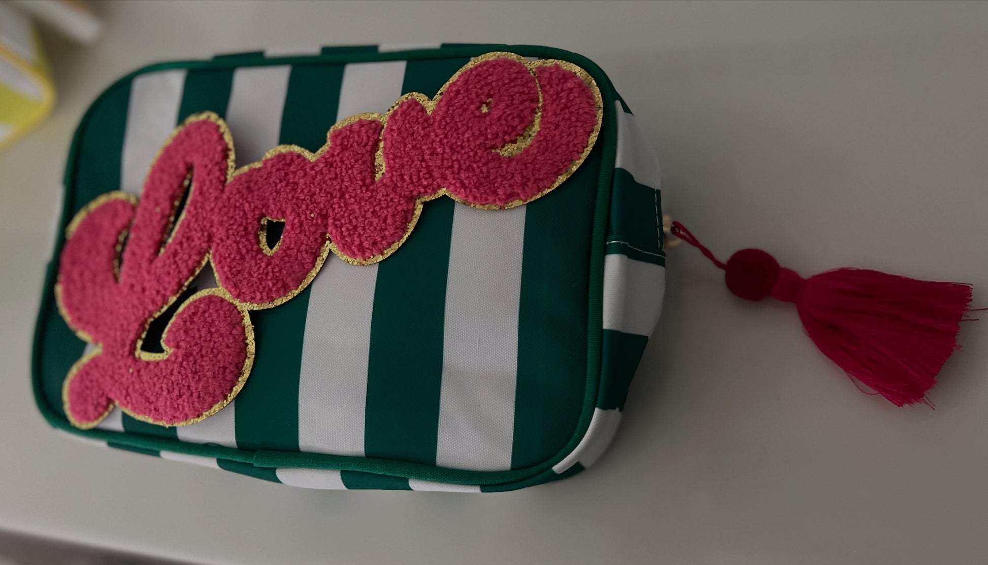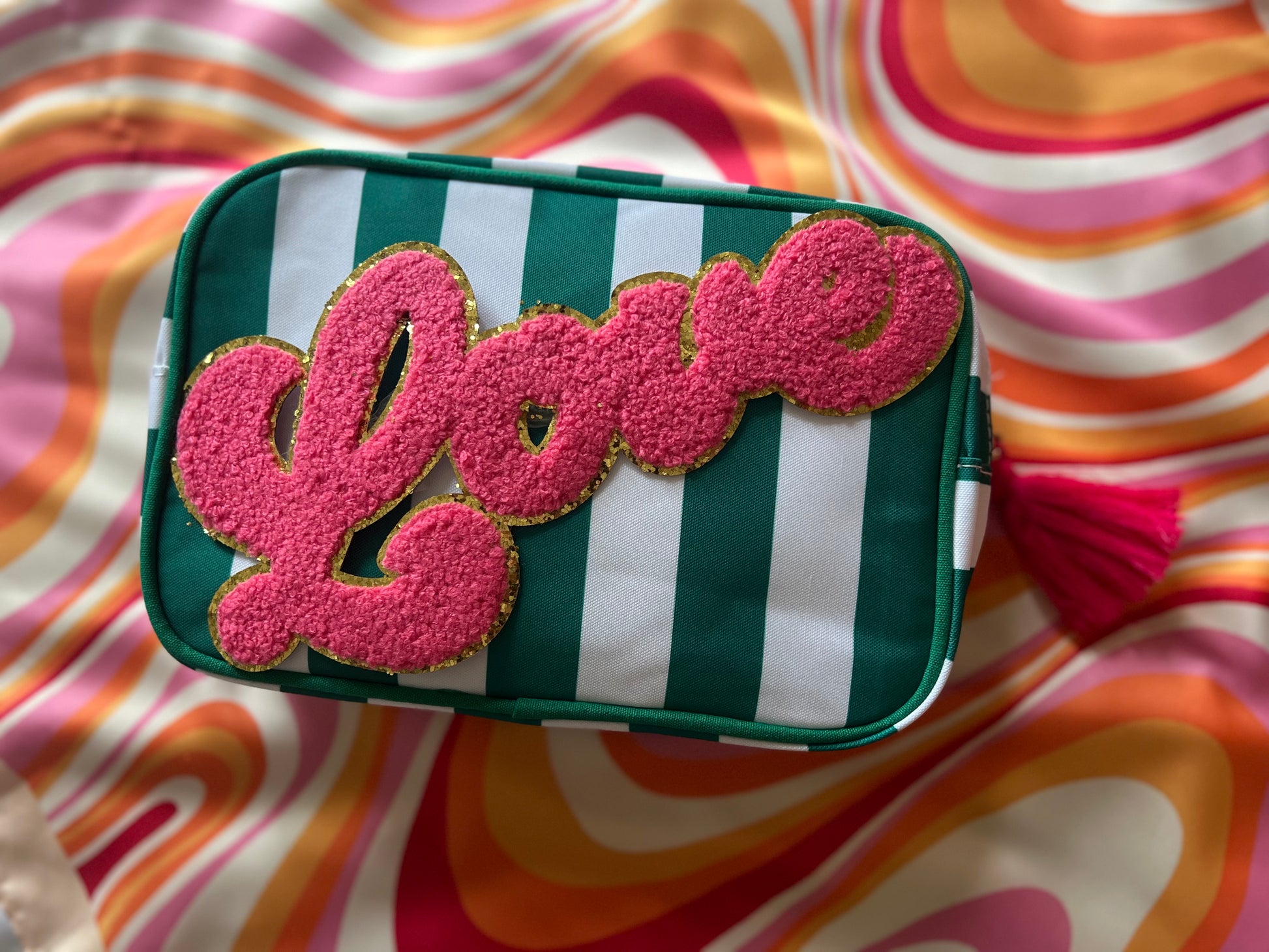 Green Striped ‘Love’ Makeup/Toiletry Bag